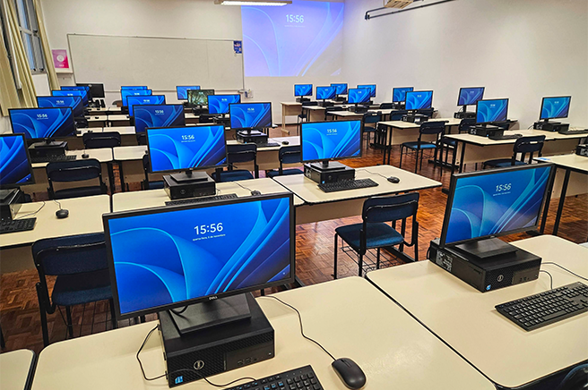 Ambiente climatizado, possui softwares de desenvolvimento e produtividade adequados para uma aprendizagem na prática.
